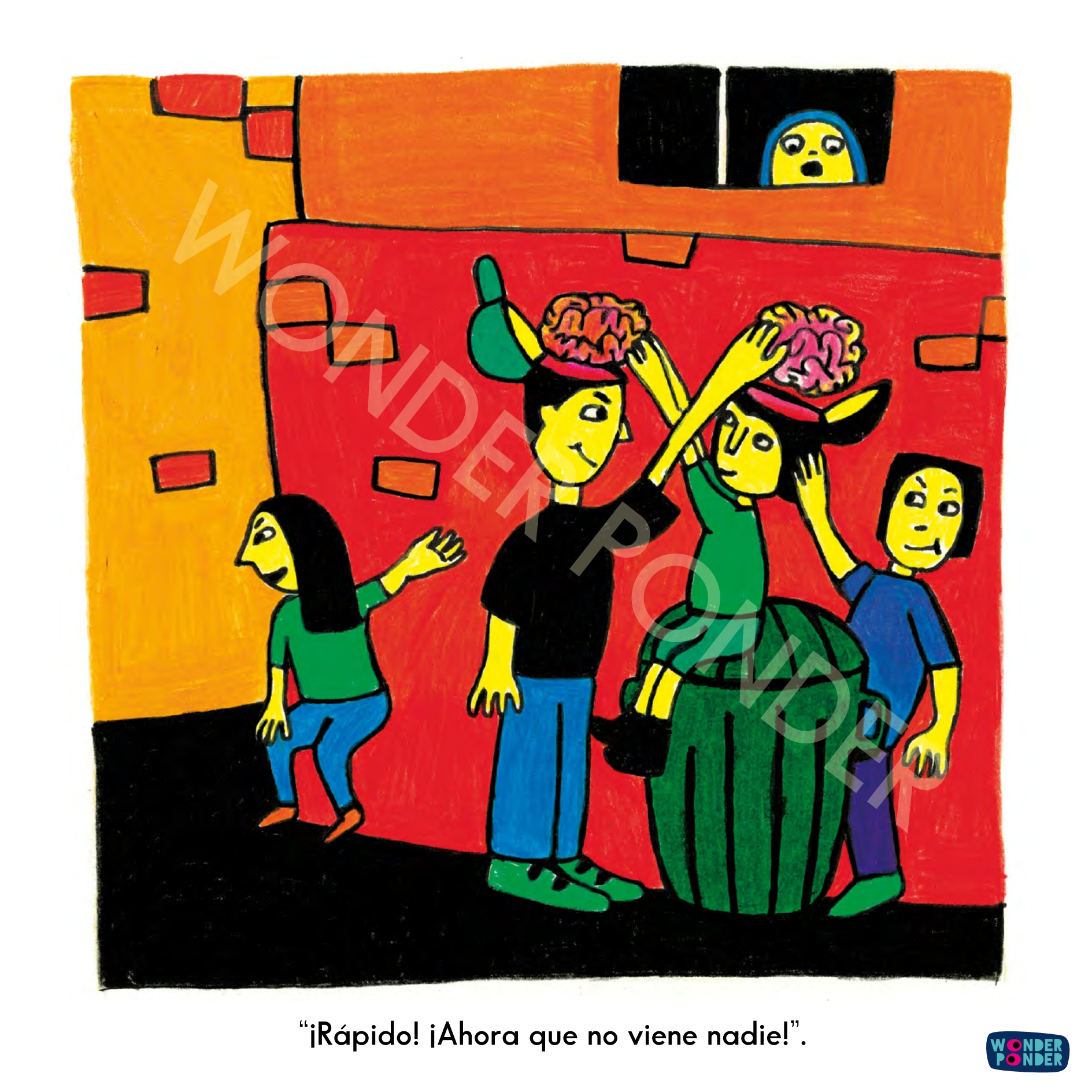 14 láminas con escenas que dan mucho que pensar. Más de 100 preguntas para mentes intrépidas. 3 láminas para crear tus propias escenas. Una guía breve para niños y adultos. Póster temático Wonder Ponder (A3). Y un método de exploración con propuestas de uso.